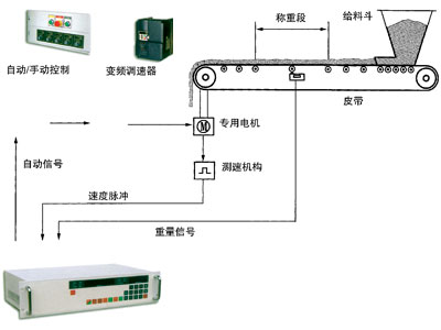 來自皮帶上物料的重量信號(hào)和皮帶運(yùn)行的速度信號(hào)被一同傳到HL500B(一機(jī)一路DCS接口)或PL3000(一機(jī)十六路)測量和控制系統(tǒng)中(HL500B和PL3000內(nèi)部均以微處理為核心)。通過連續(xù)不斷的比較設(shè)定值與皮帶實(shí)際輸送的物料重量,不停的調(diào)節(jié)皮帶運(yùn)行的速度。因此,使用物料流量總能穩(wěn)定在設(shè)定值上。